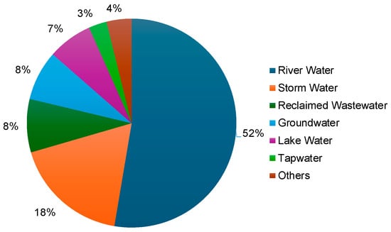 The idea of MAR is to infiltrate water into partially depleted aquifers to enhance sustainable groundwater supply from aquifers [21]. Recharged water can be stored in both unconfined and confined aquifers [22]. Aquifer water storage capacity varies depending on the aquifer type. For example, unconsolidated and highly porous aquifers may have a storage capacity of 30%, while highly consolidated aquifers may have a storage capacity of 10%, which can be as low as 1% for crystalline rocks [23]. Stored water can be recovered for various domestic, agricultural, and industrial applications. The design of the MAR system depends on a variety of factors, including geological, hydrogeological, geochemical, engineering, and biological [15]. Other important parameters, such as distance between the source water and recharge structure, and associated costs should be considered before selecting the source water [24]. An integral part of a MAR project is the availability of high-quality source water. Various surface water sources can be used for water storage in aquifers, including rainwater, water from rivers, streams, and lakes, stormwater, desalinated seawater, and treated wastewater [25]. According to IGRAC [26], the most widely used water source is river water, which accounts for 52% of the total usage, followed by stormwater (18%), and treated wastewater with 8% of the total applications, as shown in Figure 2.
