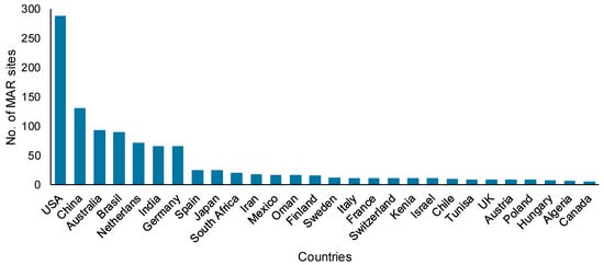 Numerous MAR projects have been implemented over the years in water-stressed areas of Europe, Asia, North America, and Africa. According to Dillon et al. [18], MAR implementation has increased by 5% per year over the last few decades. More than 1200 MAR sites have been reported worldwide, as per IGRAC [26]. The global distribution of the MAR sites is shown in Figure 3.