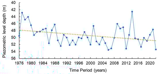 The present study is focused on the upper plain of the FVG region. The lowering of piezometric levels in the phreatic aquifers of the FVG plain resulted mainly from climate change impacts, including reduced and variable precipitation patterns and temperature increases [106]. The analysis of piezometric data, conducted on three wells of the regional monitoring network (Ufficio Idrografico) in the Mereto di Tomba area for the period 1976–2022, showed an average decrease in piezometric levels of 3 m (Figure 6).