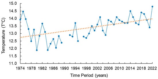 The analysis of climate data collected by the regional network for the FVG plain and processed by ARPA FVG—OSMER [109] for the 1974–2022 period shows the average temperature increase was 0.3 °C every 10 years, with a clear accelerating trend in the most recent decades, with a summer rate of increase of 0.4° per decade (Figure 7).