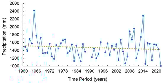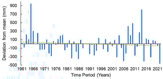 The precipitation data showed a statistically significant average decrease in eastern areas (Udine district). For these areas, a decrease in precipitation of up to 15–20% can be estimated for the period. Considering the Udine weather station, the analysis of climate indicators shows with regard to precipitation, a decreasing trend with values of—90 mm in the period 1961–2022 (Figure 8), an increase in the frequency of negative deviations (Figure 9) from the average of the 30-year reference period 1991–2020 [110], a reduction in spring and summer precipitation, an increase in intense rainfall, and long drought periods. These changes in the hydrologic regime have resulted in a decrease in direct infiltration and an increase in the surface runoff and evapotranspiration rate, thus affecting both the surface and groundwater resources in the region.