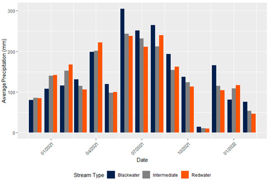 Average precipitation (mm) by stream type throughout duration of study. Data retrieved from PRISM Climate Group, Oregon State University, https://prism.oregonstate.edu (accessed 28 June 2023).