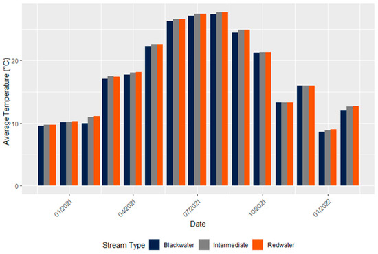 Average temperature (°C) by stream type throughout duration of study. Data retrieved from PRISM Climate Group, Oregon State University, https://prism.oregonstate.edu (accessed 28 June 2023).