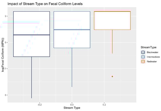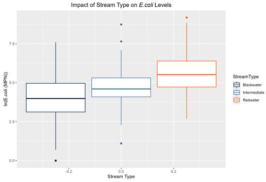 As shown in Figure 4, our study found observably different concentrations of E. coli between stream types. A statistical analysis confirmed this trend, and found that E. coli concentrations were significantly related to stream type. Redwater streams contained 1.63 logMPN (±0.91; 95% C.I.) greater E. coli concentrations than those found in blackwater streams (p < 0.001). However, intermediate stream types contained only an estimated 0.86 logMPN (±0.96; 95% C.I.) greater E. coli concentrations than blackwater streams that were not statistically significant at the α = 0.05 level (p = 0.077). Similarly, differences in E. coli concentrations between intermediate and redwater streams were also not statistically significant (0.86 MPN, ±0.93; 95% C.I., p = 0.070).