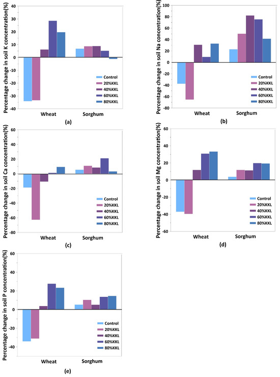Figure 1 illustrates the rate of change in soil element concentrations before and after the two experiments. The trends of change differed between the two experiments. In the wheat experiment, the element concentrations in the control treatment and the 20% KKL treatment decreased after irrigation, with significant accumulation only starting at concentrations greater than 40% KKL. In contrast, in the sorghum experiment, elemental accumulation was observed across all experimental treatments regardless of the proportion of wastewater used. Specifically, in the wheat experiment, K decreased the most in the control treatment by as much as −34.1%, while it increased the most by 40.2% in the 60% KKL treatment; Na decreased the most in the 20% KKL treatment by −50.2%, while it increased the most by 23.5% in the 40% KKL treatment; Ca decreased the most in the 20% KKL treatment by −44.1%, while it increased the most by 10.0% in the 80% KKL treatment; Mg decreased the most in the control treatment by −37.1%, while it increased the most by 32.2% in the 80% KKL treatment; and P decreased the most in the control treatment by −34.1%, while it increased the most by 25.5% in the 80% KKL treatment. In the sorghum experiment, K increased the most in the 20% KKL treatment by 13.7%; Na increased the most in the 40% KKL treatment by 70.8%; Ca increased the most in the 20% KKL treatment by 18.0%; Mg increased the most in the 80% KKL treatment by 20.2%; and P increased the most in the 80% KKL treatment by 26.9%.