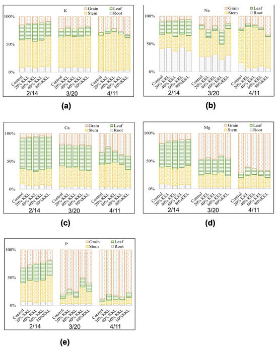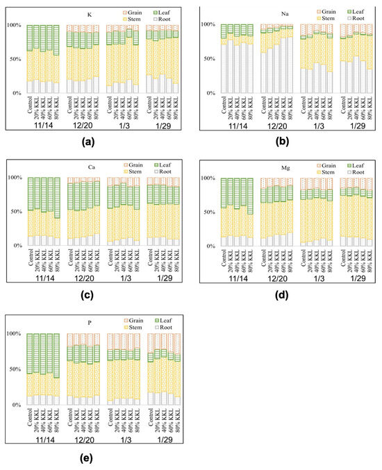 Magnesium (Mg) showed varying distribution patterns between the two crops. In wheat, Mg accumulated at the highest levels in the leaves and grains, while in sorghum, the Mg concentrations was higher in the stems, leaves, and grains than in the roots. This pattern is consistent with previous studies [52], although some research suggests that Mg can accumulate more in the roots under certain conditions [54]. Similar to Ca, Mg uptake is also subject to antagonistic interactions with other cations, which may explain the decrease in Mg concentration in the stems and grains of sorghum at 80% KKL irrigation [55,56].