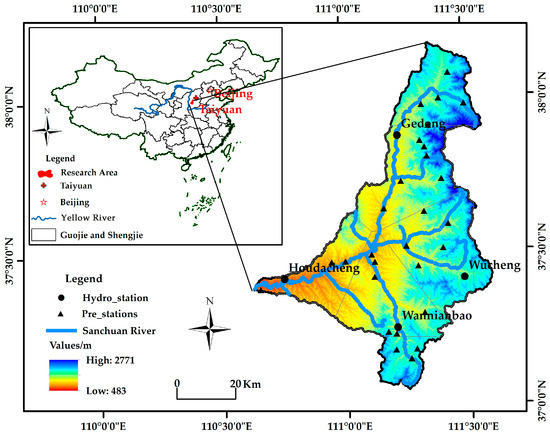 The locations of rainfall and hydrological stations in the Sanchuan River Basin in Shanxi Province.