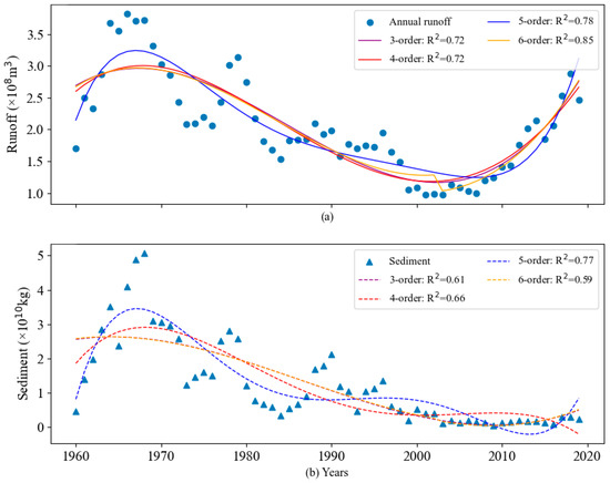 Polynomial fitting of runoff and sediment data in the Sanchuan River Basin using different orders. Note: (a) and (b) respectively show the fit goodness for runoff and sediment using different order polynomials during the study period.