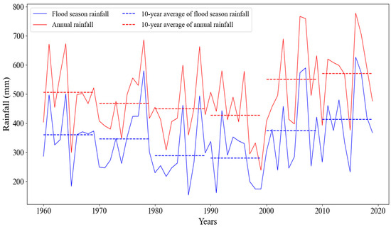 Flood season rainfall and annual rainfall variation in the Sanchuan River Basin.