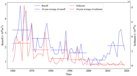Based on the data recorded by the Houdacheng Hydrological Station from 1960 to 2019, the evolution curve of runoff and sediment in the basin since the 1960s was obtained (Figure 4). It can be seen that the trend in the average runoff and sediment was consistent before 2010, decreasing year on year; the average runoff has increased significantly since 2010, almost reaching the level recorded in the 1970s, while the average sediment has slightly decreased compared to the first decade of the 21st century. Compared with the 1960s, the average runoff of the 1970s, 1980s, and 1990s decreased by 19.5%, 42.5%, and 50.0%, respectively, while the sediment decreased by 29.4%, 68.5%, and 73.3%, respectively. The runoff first decreased and then increased after the year 2000. Compared to the previous ten years, the runoff increased by 92.9% in the latter ten years, which was a decrease of only 33.2% compared to the 1960s, and therefore was equivalent to the level of runoff in the 1970s; the sediment remained relatively stable in the first two decades of the 21st century compared to the 1960s, with a decrease of 93.1% and 93.7%, respectively. Therefore, the 2000s was a turning period in the runoff of the Sanchuan River Basin, and the sediment began to enter a stable period.