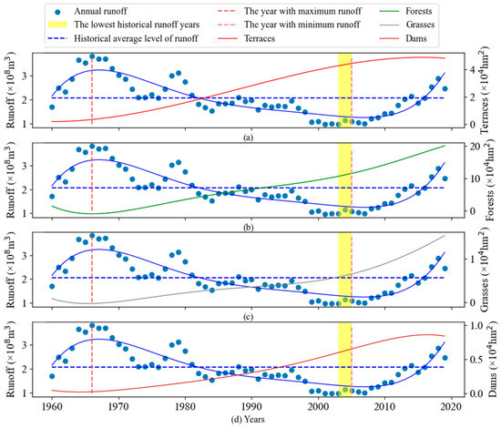 As shown in Figure 6, the runoff recorded in 2016 reached the historical average runoff level (2.1 × 108 m3). In 2019, it reached the maximum historical average runoff level, which was equivalent to the runoff level (2.96 × 108 m3) in 1967. At the maximum historical average runoff level, the areas covered by terrace, forest, grass, and dam measures were only 0.34, 0.08, 0.01, and 0.03 hm2, respectively. Between 2000 and 2010, the runoff in the Sanchuan River Basin reached the minimum historical average level (1.34 × 108 m3 in 2005). At the minimum historical average runoff level, the areas covered by terrace, forest, grass, and dam measures were 4.55, 9.73, 0.67, and 0.69 hm2, respectively. Therefore, it can be inferred that the threshold years for regulating runoff through various soil and water conservation measures in the Sanchuan River Basin are 2003–2005. Before 1967, the areas of terrace, forest, grass, and dam measures all showed a slightly increasing trend. After 1967, the four major soil and water conservation measures all showed a significant growth trend. After 2005, the terraces and dams showed a slight increase followed by a stable trend, while forests and grasses showed a significant growth trend, which was also the main reason for the increase in runoff.