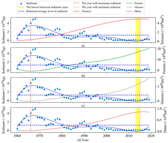 Changes in the soil and water conservation measures and sediment. Note: (a), (b), (c) and (d) respectively depicted the changes in sediment with the implementation of terrace, forest, grass, and dam measures during the study period.