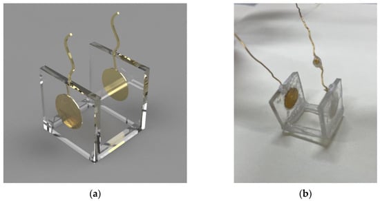 An immersible device was fabricated to carry the complex impedance evaluation, allowing for its usage and easy positioning inside the suspensions without disturbing them: the idealized prototype scheme can be seen in Figure 1a). The constructed device is shown in Figure 1b), and its main body is an acrylic made U-shaped structure (length, depth and width all equal to 19, 20, and 16 mm, respectively): a part of the bottom of the U form structure was removed (a square with a width of 15 mm) to facilitate the device displacement/placement in the suspensions, simultaneously avoid interfering as much as possible with the particle distribution in the suspension. A pair of gold circular electrodes with a 10 mm radius was placed on opposite sides of the U-shaped structure. A gold wire with a 1 mm section was soldered to each electrode; those wires were used to connect the device to the electrical impedance analyzer. For all assessments carried both at the top and bottom of the suspensions for each type of plastic type, concentration, and pH level, three acquisition runs were conducted: the depicted data in the Nyquist plots are the average values all three runs.