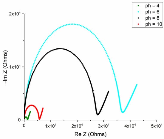 Nyquist plots of suspensions containing 0.1 g of PVC particles for different pH levels.