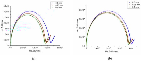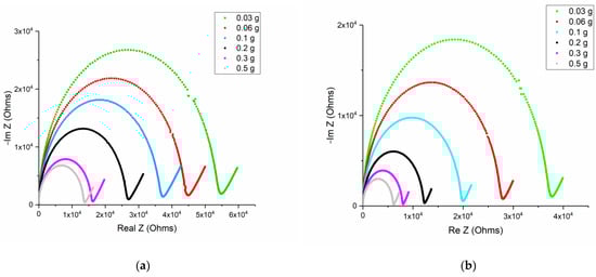 After preparing the PE suspensions for the different concentrations and pH, EIS evaluated them using the developed prototype, once again. Again, and as already described, each suspension was intensely agitated for 30 s before completely immersing the device near the surface and bottom of the jars. The obtained EIS Nyquist plots are presented in Figure 7. From them, it can be concluded that the measuring system can distinguish between PE-suspended particles with diverse concentrations, with similar trends observed for PE, both when concentration and pH change, as the ones observed for PVC. However, the sensitivity of the measurement is lower than the one observed for the PVC suspensions. That is, from the author’s point of view, mainly due to the lower superficial electrical charge present in the PE particles: indeed, when comparing the Zeta potentials (see Table 1), the PVC particle’s surface potentials for both studied pH levels are much higher than the ones measured for the PE particles. Consequently, the sensitivity regarding the detection of variations in PE particles’ concentration diminishes.