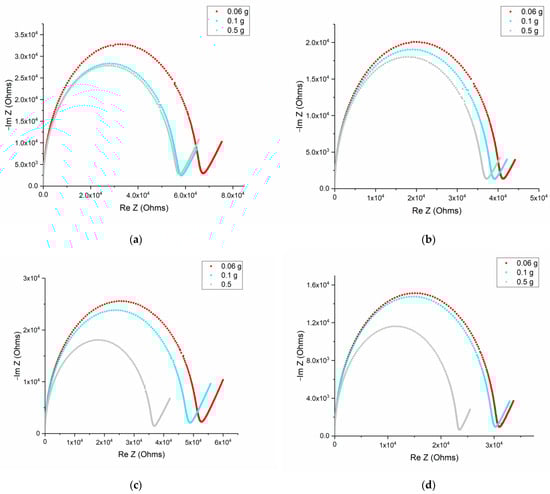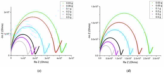 Nyquist plots for the different PVC suspensions obtained for pH 6 near the jar surface, (a), pH 6 near the jar bottom, (b), pH 8 near the jar surface, (c), and pH 8 near the jar bottom, (d).