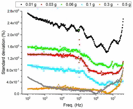 Additionally, the measuring strategy reliability was also primarily assessed. As can be seen in the Figure 5, as an example, the standard deviations estimated from the impedance modulus for the data obtained for PVC with pH equal to 6 at the bottom of the jars, the measuring approach shows to be very reliable and consistent, presenting, for all concentrations, an error around or lower than 3%. Moreover, it is observable that the error tends to be invariable in the lower frequency range up to 100 kHz (above that frequency, in the high frequencies domain, the variations observed are due to geometric capacitance charging time connected to the geometry of the device, and so does not contain useful information about charges transportation within the device, i.e., it can be disregarded in this case).