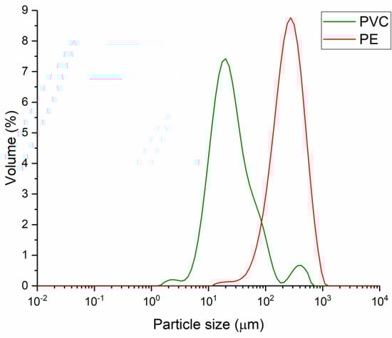 After this set of results, the authors decided to move on and check if their approach could also differentiate varying concentrations of other types of microplastics. PE was the chosen material, considering its high predominance in many effluents. The particle size distribution of the PE powder obtained by LDS can be seen in Figure 6. From these results, the average particle size of PE was estimated at around 259.49 ± 25.63 µm. For both the PVC and the PE particles, an assessment of the particle’s surface charge under the two pH levels was performed, and the Zeta Potentials are presented in Table 1.