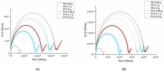 Nyquist plots comparing three different PE and PVC suspension concentrations for pH 6 near the jar surface, (a), for pH 6 near the jar bottom, (b).