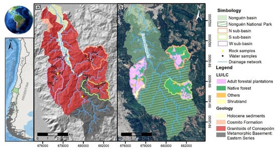 The study area shows the sub-basins: North (N), South (S), and West (W). The UTM co-ordinates’ datum is WGS 84 zone 18 south. (a) Geology of the study area (see references in text) and location of water samples. (b). Nonguén hydrographic basin with LU/LC of each sub-basin [37,38].