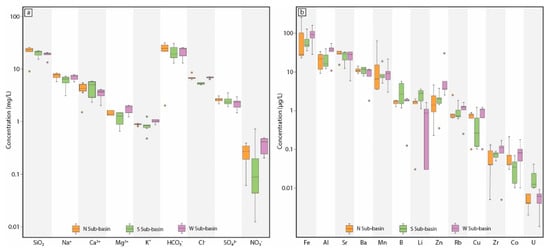 Box-plot diagram showing element concentrations in river waters for each sub-basin. (a) Major element (cations and anions) content; (b) trace element content.