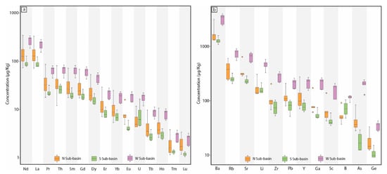 Box-plot diagram showing element concentrations in sediments for each sub-basin. (a) Rare earth elements (REE); (b) trace elements.