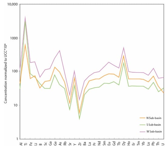 A spider diagram of mean trace element concentrations normalized to the upper continental crust (Figure 4) illustrates the distribution patterns across the three sub-basins. The diagram highlights the W sub-basin as the most enriched, followed by the N sub-basin, and then the S sub-basin. The N sub-basin is generally more enriched than the S sub-basin, with a few exceptions, following a similar trend to the W sub-basin.