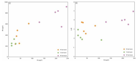 Diagrams showing the relation between (a): As (μg/L) and Rb (μg/L), and (b): As (μg/L) and Li/B, in water samples.