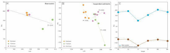 (a). Li/Sr vs. δ7Li values in water samples for each sub-basin. (b) Li/Sr vs. δ7Li values in suspended sediments for each sub-basin. (c) Li isotopic content in water and suspended sediment samples.