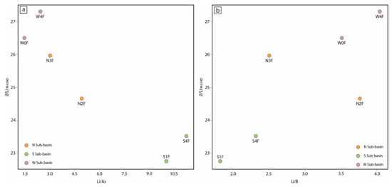 In contrast, the δ7Li values in suspended sediments revealed a different pattern compared to that observed in the river waters (Table 4). The S sub-basin exhibited the lowest average δ7Li value (δ7Li = −7.7), followed by the W sub-basin (δ7Li = −7.2), while the N sub-basin recorded the highest value (δ7Li = −6.9).