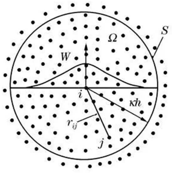 Particle approximation is an SPH approximation method. When performing particle approximation, use summation instead of integration in kernel approximation and cover all particles in the SPH domain. The specific approach is to weigh and sum all particles in the support domain, as shown in Figure 1 []. Among them, i and j represent particles, W is a smooth function, kh is the support domain, Ω is the integration region, and rij is the distance between two particles.
