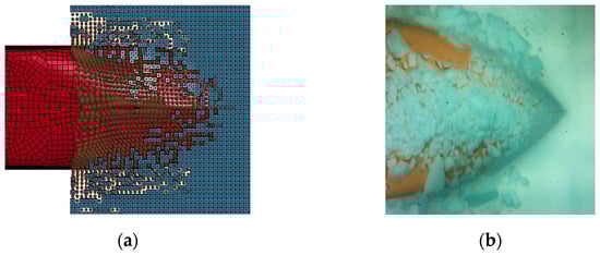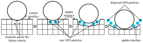 Traditional finite element methods often use element deletion when handling failed elements, which can lead to the non-conservation of mass and energy in the entire system, conflicting with real-world scenarios. However, such deletions are inevitable for describing fractured materials. Therefore, an adaptive method combining finite element and smooth particle hydrodynamics (SPH) has been established. By converting deleted elements into particles, this approach overcomes the limitations of finite element methods. Based on the idea of converting elements into particles, the method includes selecting appropriate failure criteria, coupling algorithms for particles and elements, contact algorithms between elements, and other control parameters. This method adopts the maximum tensile stress failure criterion and replaces elements that meet the failure criterion with particles. Combine particles and elements during computation. After calculation, the remaining units form large fragments, representing materials that have not yet failed. Like traditional finite element methods, material properties, failure criteria, boundary conditions, and contact algorithms are defined on the element. For failed finite element elements, delete them and replace them with SPH particles. SPH particles are tiny fragments with the same parameters, such as mass, material, and velocity. Therefore, this method not only maintains the energy and quality of the system but also avoids the abnormal deformation of the elements caused by sudden changes in the contact surface due to the deletion of elements. SPH is used to calculate the various stress conditions of materials, including compressive stress, tensile stress, and shear stress. Here, SPH particles represent crushed materials that are not subjected to tensile or shear stress and can only withstand compressive stress, thereby avoiding the tensile instability of SPH []. The details of the calculation are explained as follows. At each time step, the unit may fail and transform into particles. The adaptive method will perform the following series of operations (as shown in Figure 2):