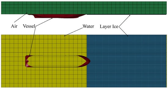 This study uses LS-DYNA software to integrate the finite element models of layer ice, fluid domain, and ship hull into a joint numerical simulation model with a coupling relationship between ice–water–ship, as shown in Figure 3. Using the control variable method, the numerical simulation of ship–ice collision is carried out by controlling the two variables of layer ice thickness and ship navigation speed. The fragmentation mode, damage deformation, and collision force curve of layer ice under ship–ice interaction are analyzed, and the calculated average ice resistance is compared with empirical formulas to verify the correctness and practicality of the method.
