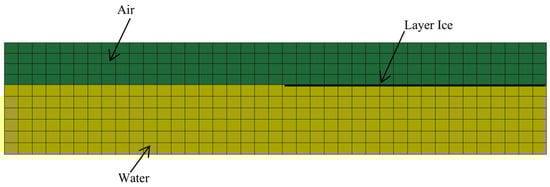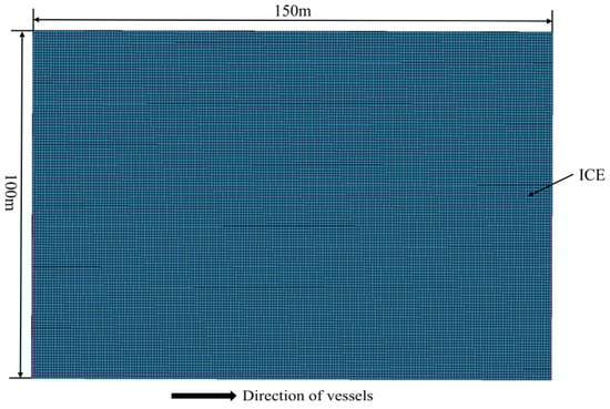 The numerical model of layered ice is constructed from solid elements. The ice material model selected material No. 13 from the LS-DYNA material library, and its failure criterion is the maximum principal stress failure criterion, with a failure criterion based on the maximum principal stress, and a threshold of 400 kPa, which is the bending strength of ice. For material parameter values, please refer to Table 2 []. The size specifications of the ice sheet are: a length of 150 m in the forward direction of the ship, a total length of 100 m perpendicular to the forward direction of the ship, and a thickness of 1 m for the ice sheet. The numerical model of the ice sheet is shown in Figure 5.
