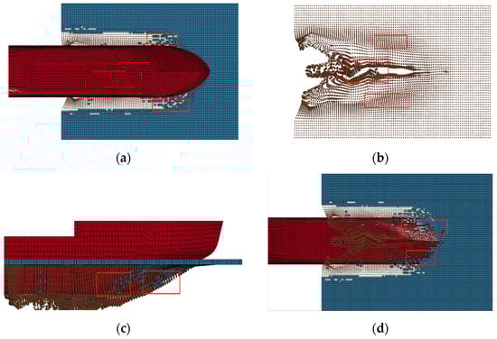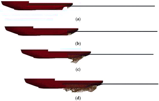 During the simulation process, it can be clearly observed that the FEM elements of layer ice and SPH particles that have undergone failure effect transformation due to the layer ice exhibiting phenomena such as fragmentation, accumulation, and adhesion. As shown in Figure 8, the bow of the icebreaker first contacts the layer ice FEM unit. The seawater provides buoyancy support for the ice layer, and icebreakers exert compressive and bending forces on the ice layer. Under these two forces, the layer ice FEM element that has reached the failure condition is transformed into SPH particles and continues to function. These forces compress the layered ice into varying sizes of crushed ice (SPH), which are tightly attached to the surface of the underwater hull due to buoyancy in the water. When moving forward under the friction of the hull, due to the wide and unobstructed water area ahead, it only floats for a certain distance under the influence of water resistance before stopping. In addition, the crushed ice is subjected to the compression and friction of the ship’s hull and the ice sheet that has not yet reached the failure effect, and most of the SPH particles produced are mainly accumulated on both sides of the bow of the ship.