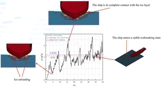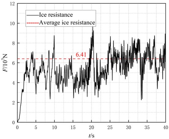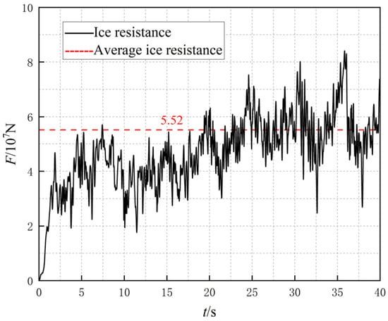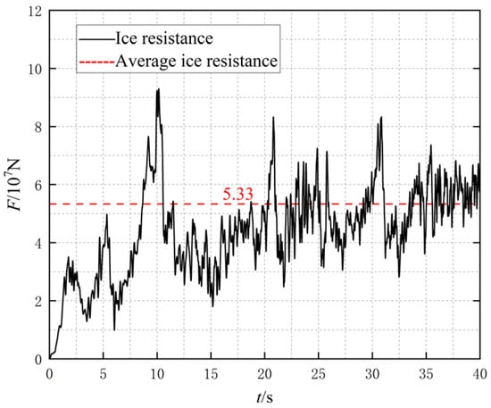 The load fluctuation displayed in the time-domain curve of ice force in Figure 9 shows obvious characteristics of compression failure, and the rapid and irregular load fluctuation of icebreaking resistance in the time history is a typical manifestation of icebreaking collision. The ice resistance time curve exhibits obvious dynamic nonlinear characteristics and can be divided into three stages: firstly, from 0 to 15 s, the icebreaker begins to move forward and makes contact with the ice layer, at which point the ice resistance is in an oscillating upward trend. Then there are 15 to 25 s, during which the icebreaker fully contacts the ice layer, but it has not yet entered a stable continuous icebreaking state. Finally, from 25 to 45 s, the oscillation period of ice resistance is basically fixed, indicating that the icebreaker has entered a stable continuous icebreaking state, and the contact area between the icebreaker and the ice layer remains basically unchanged. However, in this process, due to the failure condition of the ice unit, there will be a certain unloading of ice resistance, resulting in a certain oscillation, and the oscillation range is relatively stable. When the icebreaker is in a stable continuous icebreaking state, the average contact force between the icebreaker and the ice row during the cycle is calculated as the average ice resistance, which is about 4.19 × 107 N. The result obtained by calculating the average ice resistance using the Lindqvist formula is 4.4165 × 107 N, with an error of 5.13%, which verifies the correctness of the numerical simulation results.