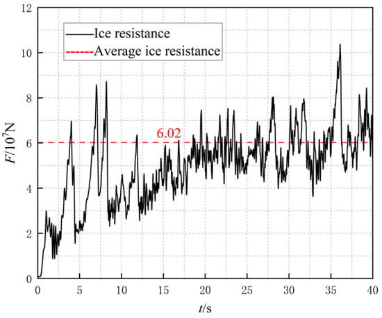 When the bow of an icebreaker collides with layer ice at different speeds of 1, 1.5, and 2 m/s, the time history curve of ice resistance is shown in Figure 10, Figure 11 and Figure 12. It can be observed from the figure that all three operating conditions have frequent repeated loading–unloading states of collision force, indicating a strong collision process. At a ship speed of 1 m/s, the collision reaches a stable state in about 33 s. Based on the stable stage, the average ice resistance is calculated to be 4.19 × 107 N. At a ship speed of 1.5 m/s, the collision reaches a stable state in about 23 s. Based on the stable stage, the average ice resistance is calculated to be 5.33 × 107 N. At a ship speed of 2 m/s, the collision reaches a stable state in about 18 s. Based on the stable stage, the average ice resistance is calculated to be 6.02 × 107 N. It can be seen from these three operating conditions that as the ship’s speed increases, the maximum collision force between the ship and the ice layer also increases, resulting in a higher average ice resistance and more intense collisions.