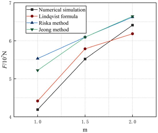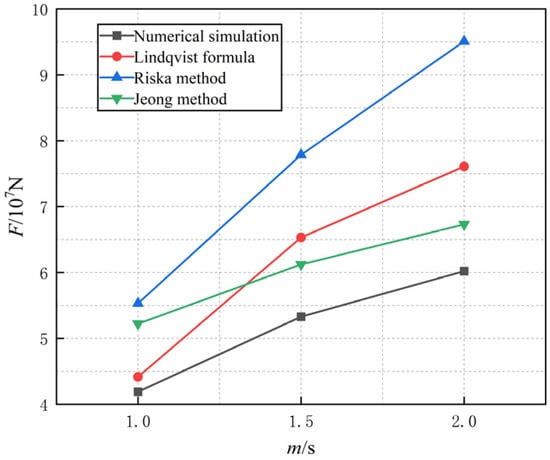 Icebreaking ships are subjected to enormous structural pressure during icebreaking. Too fast a speed may cause damage to the ship’s structure, especially during continuous icebreaking operations, while too slow a speed may not effectively break the ice. According to Wu’s series of professional icebreaking tests conducted during the maiden voyage of “Snow Dragon 2” in Antarctica [], a speed of 0–5 kn was selected to maintain sufficient momentum for icebreaking without causing excessive pressure on the ship’s hull. The simulation duration of this article is 40 s, and it moves uniformly in a straight line along the x-axis at a speed of 1.5 m/s. The obtained resistance values are compared with empirical formulas, including the Lindqvist empirical formula, Riska method, and Jeong method.
