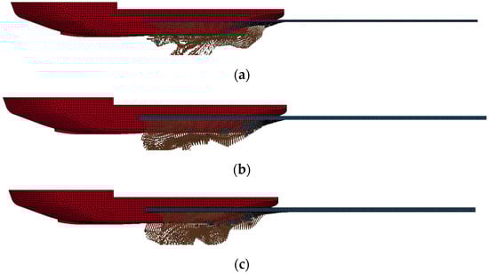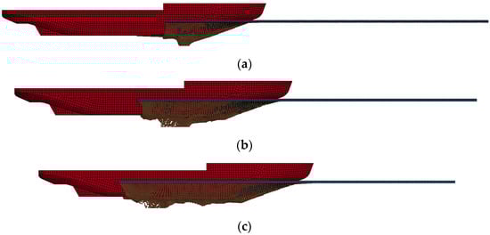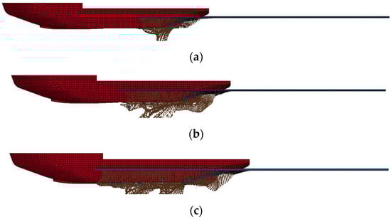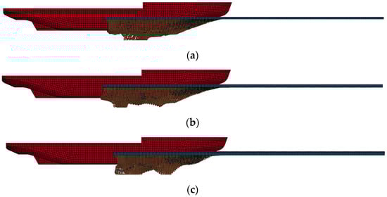 The process of ice–ship interaction at different speeds in the stern icebreaking state. (a) V = 1 m/s, (b) V = 1.5 m/s, (c) V = 2 m/s.