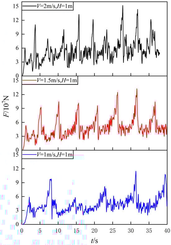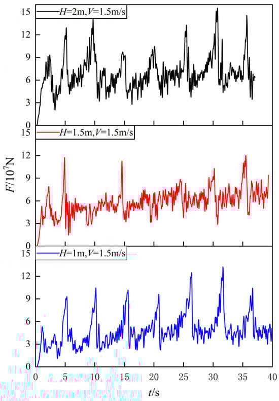 To investigate the dynamic characteristics of the influence of flat ice thickness on ice load, a ship was driven at a constant speed of 1.5 m/s through flat ice areas of different thicknesses. Accordingly, the relationship curve between ice breaking load and time was plotted, as shown in Figure 24. The analysis of the curve shows that under various thickness conditions, the ice load exhibits significant fluctuations. In thinner ice layers, the amplitude of ice loads experienced by the hull is relatively small, and the load fluctuations exhibit a consistent pattern. In addition, as the thickness of the flat ice layer increases, the volatility of ice load significantly increases, and the peak value also increases accordingly. Especially in a 2 m thick ice layer, the ice load fluctuates violently, which may induce ice- induced vibration of the hull and pose a significant threat to the safety of the hull structure. Therefore, these factors should be carefully considered during the design and construction of icebreakers.