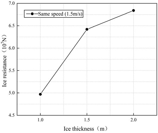 To further explore how ice load varies with the thickness of flat ice layers, this study calculated the average ice load of the ship under different ice layer thickness conditions and, based on this, plotted the relationship between the average ice load and ice layer thickness. As shown in Figure 25, with the increase of ice thickness, the average value of ice load shows an upward trend. Specifically, when the thickness of the ice layer is 1 m, the minimum measured ice breaking resistance is about 4.97 × 107 N. When the thickness of the ice layer reaches 1.5 m, the value increases to 6.42 × 107 N, which is 29.17% higher than the working condition with an ice thickness of 1 m. When the thickness of the ice layer is 2 m, the ice breaking resistance further increases to the maximum value of 6.84 × 107 N, which is 37.62% higher than the working condition with a speed of 1 m/s. This is because the ship collides with the ice layer at a constant speed, rather than giving an initial velocity. Therefore, when the ship collides with the ice layer, thicker ice layers will generate larger ice loads. This numerical simulation is in line with common sense.