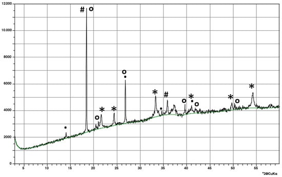 Figure 1. XRD pattern of the as received VBR (*: goethite; #: gibbsite; •: quartz; ○: hematite).