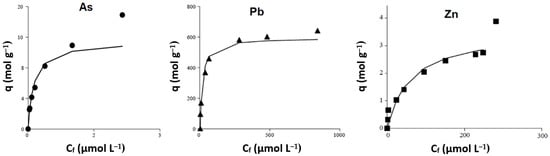Adsorption isotherm plots were calculated using Equations (1)–(3) and show the variation in function of Cf (q corresponds to the quantity of the metal adsorbed by the VBR, expressed in mol·g−1, and Cf the metal concentration in solution, at the equilibrium, in mol L−1). These isotherms are shown in Figure 2.