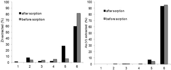 Figure 3. Zinc and arsenic (V) distribution on VBR at Step 2 of the sorption experiments. Extraction with nitrate magnesium Mg (NO3)2 (Step 1); sodium acetate NaOAc (Step 2); hydroxylammonium chloride NH2OHCl (Step 3); ammonium oxalate-oxalate acid (NH4)2C2O4-H2C2O4 (Step 4); (NH4)2C2O4-H2C2O4–C6H8O6 (Step 5); nitric acid-ammonium acetate HNO3-NH4OAc (Step 6).