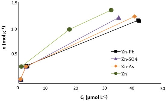The results show an effect of competition between these elements. Indeed, the isotherms calculated for each of the pairs (Figure 4) show a decrease in sorption compared to the single zinc element. We thus observe the following distribution of Zn, Zn-SO4, Zn-As and Zn-Pb, with further lower slopes. This would suggest that the intensity of adsorption is the lowest in the case of the Zn-Pb couple, reflecting a competition effect between these two cations.