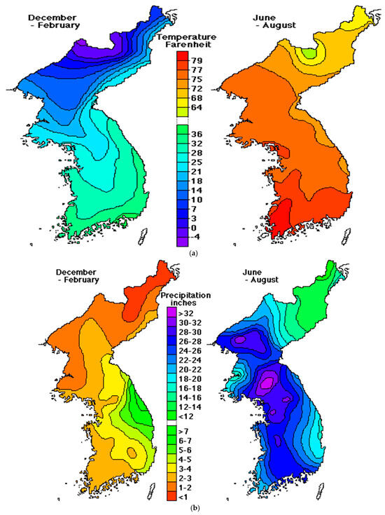 (a) Average winter (left) and summer (right) temperatures in Korea. Note the break in the temperature scale. Summers are much hotter than winters. Please note temperatures are in Fahrenheit. (b) These maps show the average winter (left) and summer (right) precipitation in Korea. Note the break in the precipitation scale.