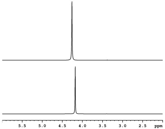 Bruker Avance II+ 600 NMR is used to measure 1H NMR spectra. The device uses a 5 mm direct-direction dual broadband probe [52]. The experimental temperature is 293 K. The 1H NMR spectra have the following parameters: 128 time domain points, spectrum width 9600 Hz, 15 scans, and 60 s relaxation delay. The chemical shifts were connected to the DMSO-d6 resonance used as an external reference of 2.5 ppm. The DMSO-d6 was placed in a coaxial capillarity in the sample tube and used as a lock signal.
