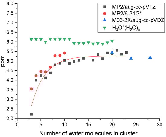 Average chemical shifts of modeled H3O+(H2O)x clusters under fast exchange conditions calculated using GIAO/SMD/MPW1PW91/6-311+G-(2d,p) method combined with B3LYP/6-31++G** optimized geometries (starting geometries are taken from https://www-wales.ch.cam.ac.uk/~wales/CCD/H3O+..H2ON/gmin.html, accessed on 26 February 2018).