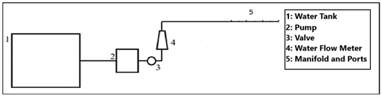 The experimental investigation focused on the changes in the output flow values and behavior of water and air–water (two-phase) mixture flow models passing through a horizontally placed manifold pipe system. The study aimed to examine the effects of different air–water flow rates on the manifold port exit diameters and their impact on the output jet lengths. For this purpose, four different systems were designed, and water circulation was carried out at different flow rates from a 300 L water tank into a manifold pipe system with a length of 250 cm and an inner diameter of 12.7 mm, having five port exits.