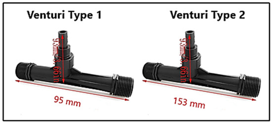 Two different types of Venturi devices were used in this study (Figure 4). The technical specifications of these Venturi types are provided in Table 1 and Table 2. The dimensions of the Venturi devices used in this study comply with ASME standards [20]. Different water flow rates, air vacuum flow rates, and transfer efficiencies were experimentally examined.